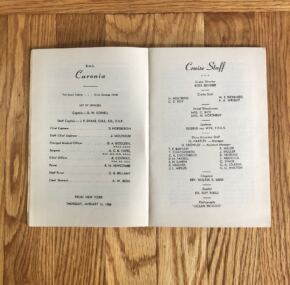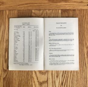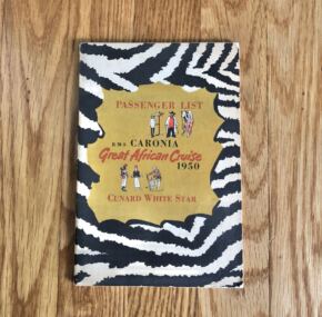 Lovely passenger list for the first big cruise Cunard did after World War II. The Great African Cruise of 1950. Most of the world was still recovering from the devastation of the Second World War so Cunard chose to go to countries that were not very hard hit by fighting. Of course, they chose Caronia to bear the house flag since she was their newest ship and was specifically built with long cruises in mind. Among the passengers on board are Harold Vanderbilt, great grandson of the dynasty’s founder and arguably the last really rich Vanderbilt. He and his wife occupied the best suite on board, naturally. Comes to us from the collection of the cruise director on this voyage, Ross Skinner. Great condition with a few small pen marks inside.