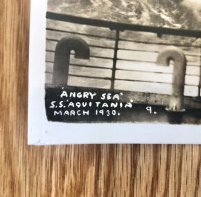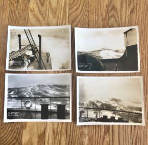 A set of four photographs taken by the ship’s photographer during a storm in mid-Atlantic in March, 1930. That would have been quite a ride! How would you like to have been on board? They measure about 5″x 7″.