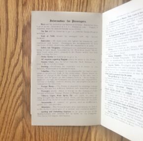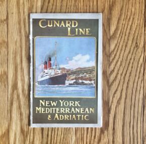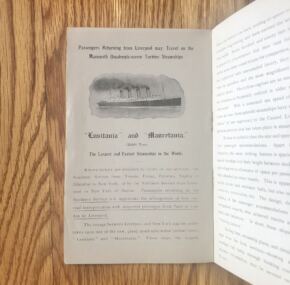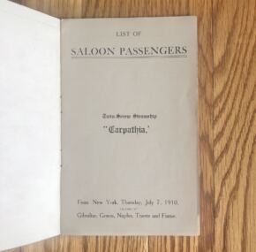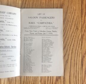 Rarely seen and much-sought-after passenger list from the RMS Carpathia, rescuer of the Titanic survivors less than two years after this list was printed. Dated July 7, 1910, this first-class list is for her voyage from New York with Captain Charles Smith in command. Varuous maps, schedules, and lots of information about the on-board services.