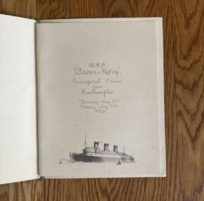 Just prior to the maiden voyage of the RMS Queen Mary, Cunard and John Brown sent the liner on a two-day inaugural cruise, and here is a menu from that trip. As befitted a pre-war menu for first class, it is in French. Dated May 14, 1936, and in excellent condition. Never seen another!