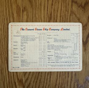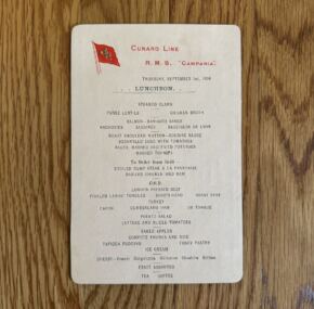 Lunch menu for the Cunarder RMS Campania, sister of the RMS Lucania. Dated September 1, 1904, this menu is almost certainly first class and has an embossed Cunard house flag in the corner. Complete with gold edges. On the back is listed various wines, champagnes, sherries, cigars, etc., along with prices. One of the hardest Cunarders to source items for.