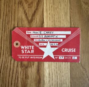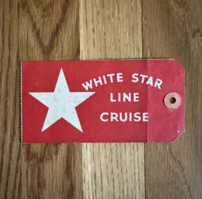 Cruise baggage tag for a voyage on the RMS Adriatic on March 29, 1934–just 6 months before she was withdrawn from service. The passenger was Miss E. Carey, who sailed in Cabin 49 on E Deck. An old fold but otherwise in very nice condition. My favorite of the Big Four. Adriatic would have been a great ship to cruise on.