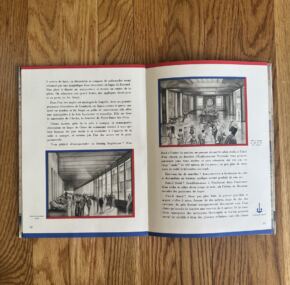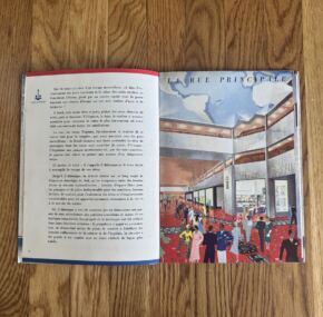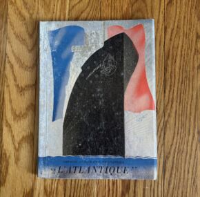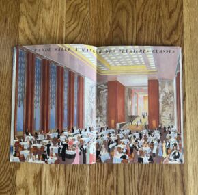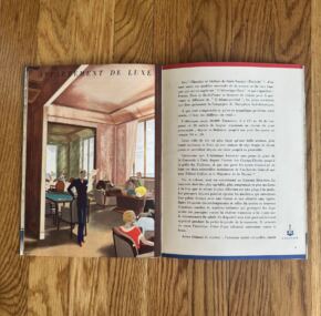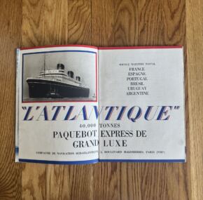 Never had one of these amazing brochures before.  A fantastic 36-page brochure for the most impressive ship ever to sail on the South Atlantic service.  In French and sporting stunning renderings of her interior, including many in color.  She was a preview of what to come on CGT’s ss Normandie a few years later!  The images are Art Deco masterpieces.  Fitting for such an impressive and well-regarded Art Deco masterpiece herself.  ss L’Atlantique was owned Compagnie De Navigation Sud Atlantic which was supposedly a subsidiary of CGT although I’m not sure it was given the rather complicated nature of the French government’s holdings in the various French ocean-liner companies.  Of course, the ship was tragically lost to fire.  Such a magnificent ship, and if you can imagine, she was in service for only 15 short months!  Exceedingly rare.  Cover has some issues, but the contents are perfect.