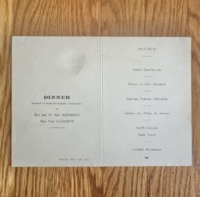 There is the best, then the best of the best, and then perhaps, just sometimes, there is even better…. This menu represents the best of all. A private dinner “tendered on the flagship *Normandie*” to the Alexanders. Classic and beautiful menu stock with the ship’s famous shield embossed. The meal looks fantastic as one would expect as well. Excellent condition and oddly never folded!