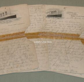 Here’s your chance to own a museum-quality item! A letter written on board the Lusitania’s last aborted voyage by second-class passenger Elsie Hardy, detailing her daily activities. Saved from the sinking, this letter has some interesting and specific details about the last crossing. For example, she discusses boarding the liner, losing a piece of luggage, the location of her dining room table, her table companions, and much, much more.