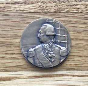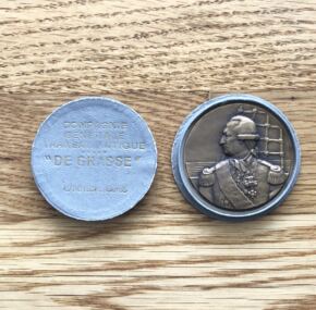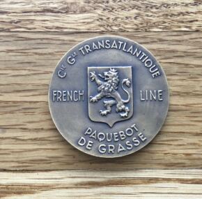 An old friend always refers to De Grasse as CGT’s “spunky” ship. What he means is that she was built as an intermediate liner in the 1920’s, but after the war, she alone carried the French flag and reestablished French Line service to New York for two lonely years until the Ile returned to service in 1949. Connoisseurs of French Line medallions (among which I count myself) know that the few ships that did pre- and post-war service had two medallions made for them. Designed by M. Delannoy. This is De Grasse’s post-war medal. Highly sought-after and in excellent condition and happily in its original box.