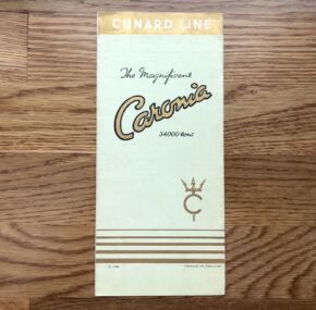 Nice full-color brochure produced for Cunard Line’s fantastic Caronia.  Twelve images for her interiors and exteriors.  Measures 16″ x 18″ inches.  Very good condition.  I had 15 of these! You guys cleaned me out and this is my last one.