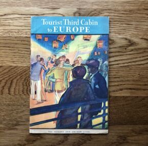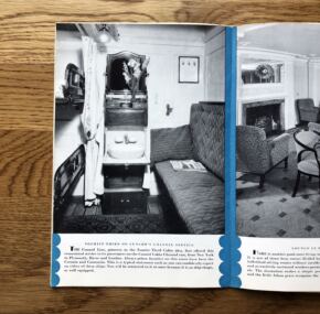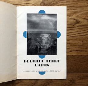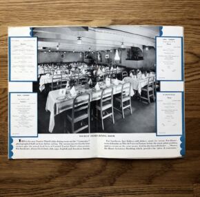 One of my favorite things about Cunard’s brochures from the 1920s is that they give us a look inside their smaller, more intimate ships as well as their larger liners, especially in their lower classes. This tourist-third cabin booklet does just that. Runs 20 pages with photos on board Scythia, Laconia, Transylvania, Caronia, Carmania, Lancastria, Tuscania, Cameronia, California, and yes, even Berengaria! Quite lovely and comfortable looking. The center spread shows sample menus for breakfast, lunch, and dinner. Great condition.