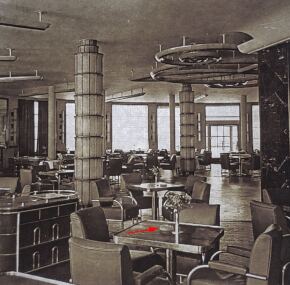 Most desirable frosted-glass ashtray from the tables of the fabled ss Normandie. Note the archival photo of it use in the Grill Room of the famous CGT ocean liner. In very good condition and measures about 5″ across. A few air bubbles here and there from the manufacturing process. Archival image from the collection of Anthony DiMattia.