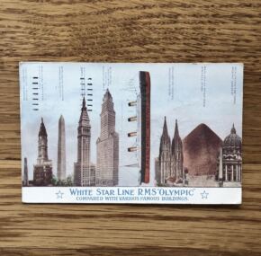 Cool and iconic color artist card imagining RMS Olympic compared to various buildings of her time. Written and posted in April, 1922–the gravy years for this beloved White Star Liner.