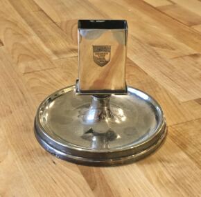Very impressive ashtray with match holder. Proudly marked Canadian Pacific Steamship services. “World’s Greatest Travel System”. Dates 1920s by the style of it. In excellent condition. Measures about 5″ across the weighted base and 4″ tall.