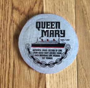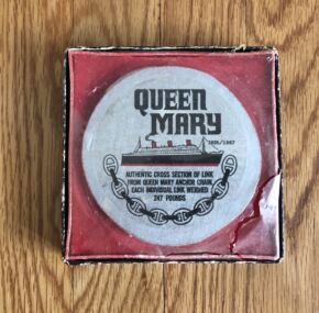 A slice of the famous ocean liner RMS Queen Mary. Own a bit of her anchor chain. This is one of the earliest and most interesting souvenirs made from the original fittings of the ship when she came to Long Beach nearly 55 years ago. In its original box and still covered in the cellophane from the on board gift shop. Some wear to box and brittleness and cracking to cellophane. It measures about 4.5″ across in the box.