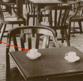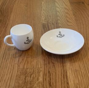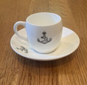Cunard 1907-era bone-china demitasse cup and saucer as used on board the RMS Lusitania and other ships of the fleet. While writing this description, I thought of a passenger sitting down to refreshments in the Verandah Cafe on board Lusitania, and when done, slipping this cup and saucer into a bag to take home as a souvenir.