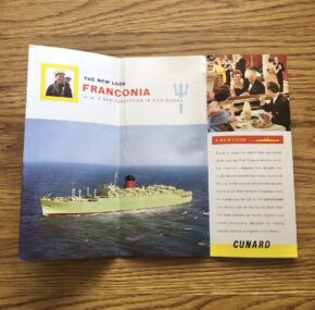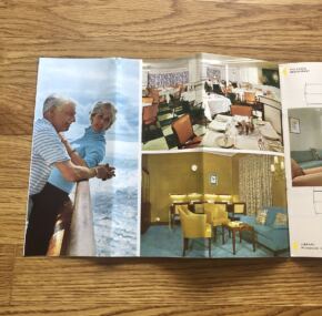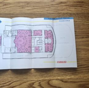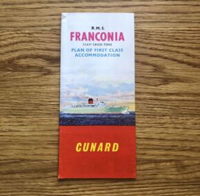 The Cunard Line was really proud of the remodeled and renamed RMS Franconia, formerly the RMS Ivernia. This first-class deck plan is more of a brochure for the redesigned liner’s life as a cruise ship. Sporting an astonishing 28 color photos, it shows all the work that went into re-decorating the liner. Cunard tried very hard indeed, but it seems to me they failed! Perhaps I am just not in tune with those 60’s interiors. Still, an interesting time at the company and not often seen. I don’t think I have ever had another.