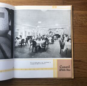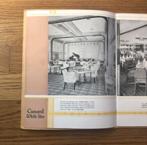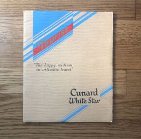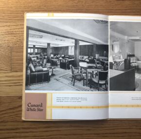 The big version of what must have been one of the first and certainly the finest of the brochures produced for the newly merged Cunard White Star Line circa late 1936 or so. It runs 16 pages with the first quarter of the brochure showing second class for the upcoming RMS Queen Mary and sporting a full-spread centerfold of this amazing new liner. But what a delightful hodgepodge the rest of the brochure is. Franconia, Britannic, Scythia, Aquitania, Berengaria, etc. The fleet was a real mix-up in the 5 years following the merger of the two famous companies. Also shown are cabins for the small A Class oddities built in the 1920s that still had only running cold water and no hot in their cabins. In very good condition.