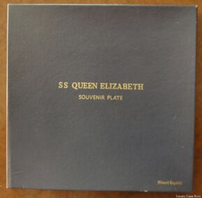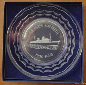 Highly sought-after Stuart Crystal souvenir plate made in commemoration of Queen Elizabeth’s long years of service with Cunard. In the famous “Wave” pattern, which is identical to the on-board crystal. A small card flyer in the box tells us that Stuart was the proud supplier of her crystal service for the Queen’s entire life. Most likely these were sold onboard in her last year. Was any left-over stock also sold on the QE2 in the few years after Queen Elizabeth’s departure? Perhaps, but what I can say is that they are lovely and very tough to find. This one is still in its original box and comes with the information card. Measures about 8¼” in diameter. The box measures about 9” x 8½”.