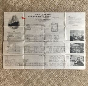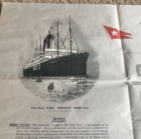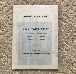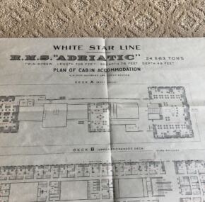 Very fine tissue deck plans for the RMS Adriatic of 1907. Famous member of the Big Four ships built from 1901-1907. Covers her first class. By this time, White Star Line was calling this cabin class. In fact, this was such a recent development that this is one of her first plans for this new type of service. Dated February, 1928, it measures about 34″ x 22″ and is in excellent condition.