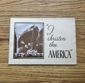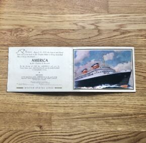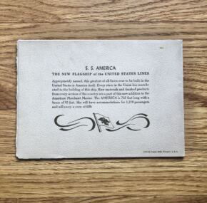 Here is a rarity indeed. The launch brochure for the ss America dated August 31, 1939, and launched by Eleanor Roosevelt. Sports a fantastic tipped-in full-color image of the ship. In fact, the photo on the front of launch day is also tipped in. United States Lines was highly proud. Sadly, this beauty ended her days beached on the Canary Islands. Excellent condition. Grab it because it will be a long time until I find another because of the rarity!