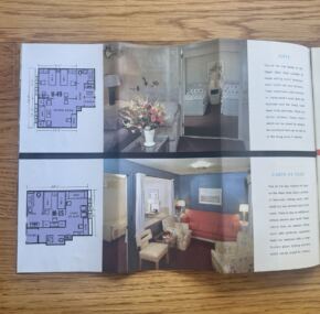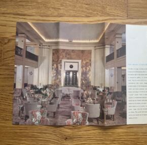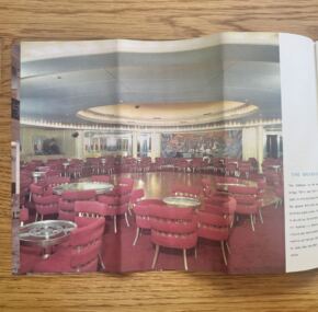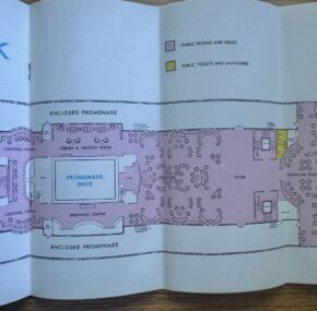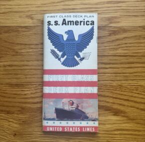 Beautiful color-coded first-class deck plan for the United States Lines ss America. She really did have lovely interiors. So warm and comfortable looking. Very stylish. Loads of color photos in this one that showcases how fantastic she was inside. Excellent condition.