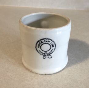 Incredibly sturdy earthenware coffee cup for the American Line. Has the heft of third class. Sourced by our old friends Stoniers of the UK. Has a hairline on one side but displays well and incredibly rare to find anything like this for this line.