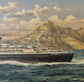 Exquisite original painting of the Italian liner Andrea Doria by well-known maritime artist Robert Lloyd. Showing the liner passing Gibraltar, the frame measures about 32″ x 23″. Great opportunity to own an original painting of a beautiful ship by one of the leading maritime artists of our time. AC