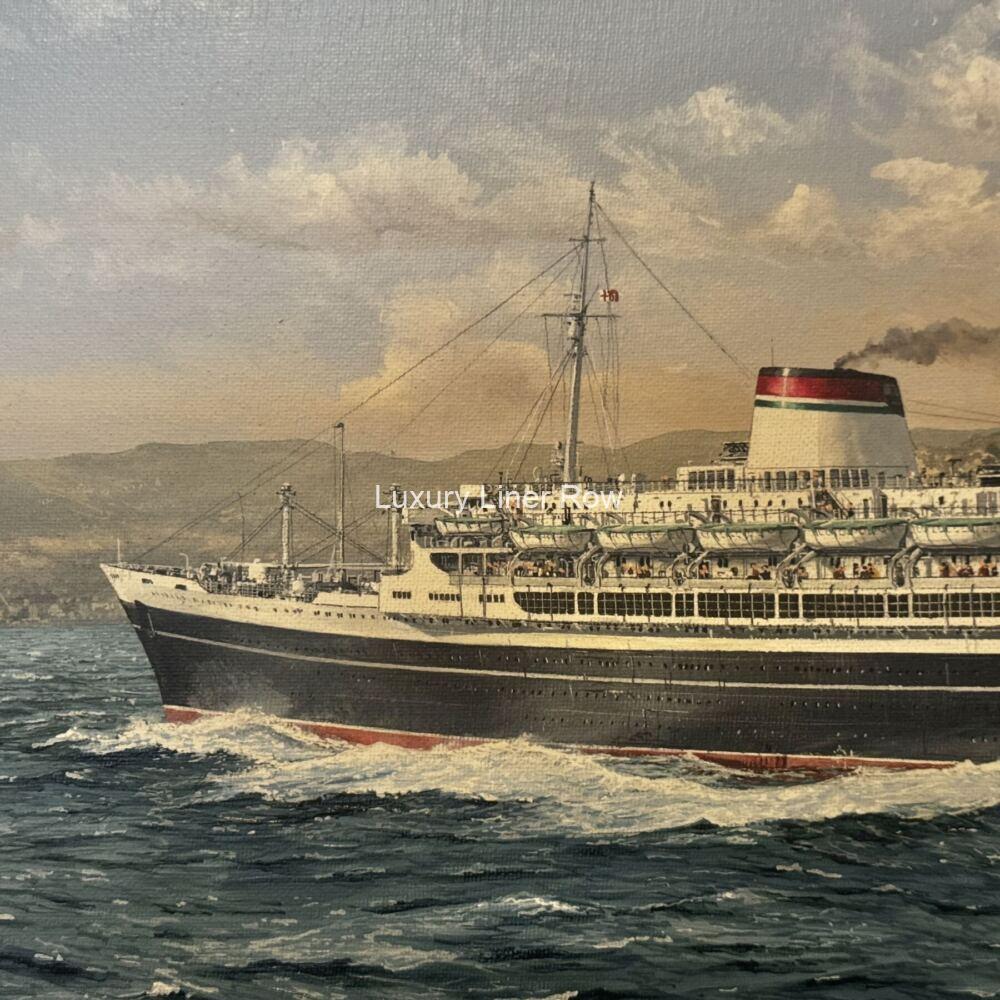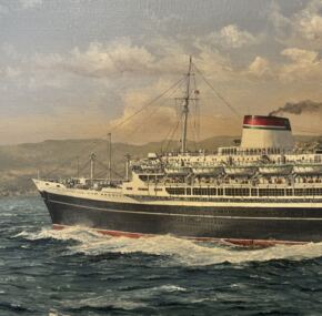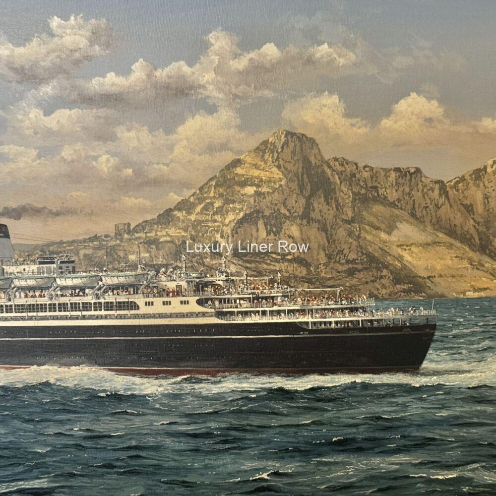 Exquisite original painting of the Italian liner Andrea Doria by well-known maritime artist Robert Lloyd. Showing the liner passing Gibraltar, the frame measures about 32″ x 23″. Great opportunity to own an original painting of a beautiful ship by one of the leading maritime artists of our time. AC