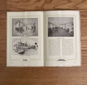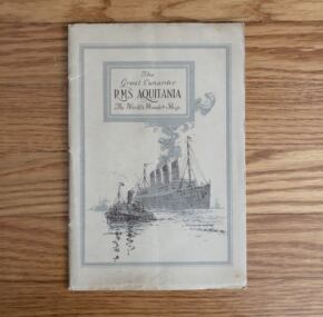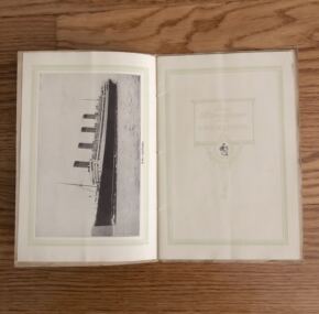 A very early brochure for her, probably from her entry into service. 32 pages with 30 images, many I haven’t seen elsewhere. Huge amount of information about the rooms and heavy concentration on the decorative style with a lot of information about which period rooms were copied from where. Covers first, second, and third-class. Extensive talk of her lifeboats and water tight compartments in the light of Titanic being so recent in memory. Very good condition with an old fold on the back cover. Tied with a silk cord.