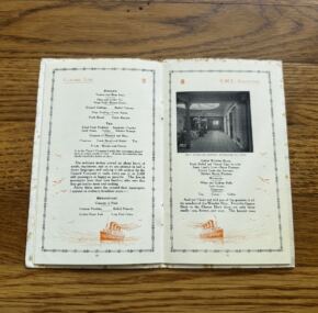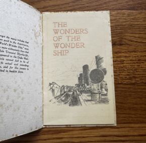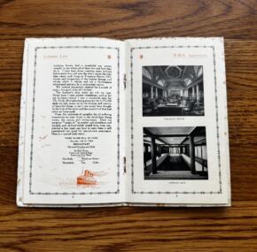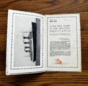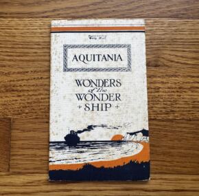 “Wonders of the Wonder Ship.” This brochure consists of an entire article written about Aquitania by Viscount Northcliffe, the UK press baron. Northcliffe died in 1922; so this brochure, while post war, must be quite early in the 1920s. The article, as one might expect written by a lauded newspaperman, makes you feel like you are on board the great liner. 16 pages long and in excellent condition with some foxing to cover.