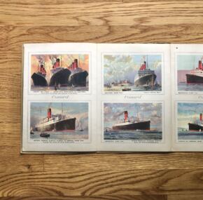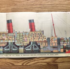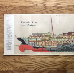 Simply fantastic full-color cutaway for Cunard’s RMS Aquitania. In excellent condition aside from some pin holes. Does not detract. All the typical iconic views are shown including the athwartship cutaway and color views of the ships interiors. Interestingly, I found one of these in the UK last fall. It came with a bunch of items from a 1949 crossing on Aquitania to Canada. I suppose they printed enough that they were still giving them out in the late 1940s! Don’t we all wish we had a stack of them….