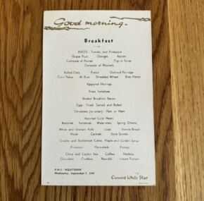 Post-war breakfast menu for the Aquitania dated September 7, 1949. Printed just two and a half months before she was taken out of service, this Cunard White Star menu has a pretty good selection for a post-war austerity voyage to Canada. Post-war Aquitania items are not only rare but very hard to find. Excellent condition.