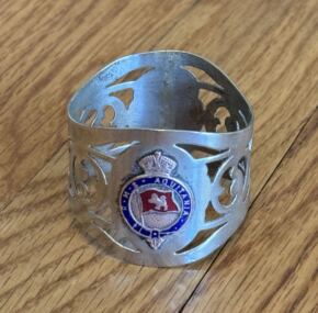 Aquitania was the second-longest-serving Cunarder and one of the line’s most popular ships. Yet the number of quality souvenirs for her in excellent condition does not reflect that popularity. Good souvenirs for her are very difficult to find. She’s definitely one of my favorites, and I think I would like to sail on her more than almost any other 20th century Cunarder. With a few exceptions…. can you guess which ones? This napkin ring is in very good condition with no damage to the enamel badge and house flag. Slightly out of round which could be easily fixed but I leave that choice up to you as it will display nicely as is.