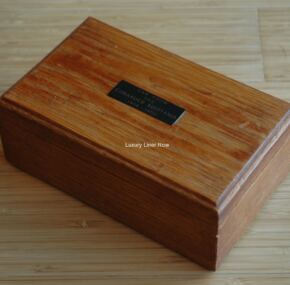 It is often tough as a dealer as well as a collector to decide what to keep and what to sell. The rarity of this Aquitania cigarette box makes me want to keep it. On the other hand, it is fun to update the site with rare and interesting items. That’s the feeling that must win out in my mission to bring you the best and most interesting collectables. This box is one of those items that make me pause, though. Only 200 of these boxes were made out of wood from the Aquitania when she was scrapped in 1950. A surviving Cunard memo about these boxes states that they were to be sent as gifts to the people and firms Cunard loved most. Among these was John Brown, Harland & Wolff, various long-serving employees, and of course, Cunard’s board of directors. With only 200 made 62 years ago I wonder how many are still around? At any rate they are quite rare, and I am glad they saved anything from her at all. In very good condition with a few scuffs and scratches that a good oil cleaning could mitigate. Original cedar lining. Measures about 7½” long x 4½” wide, x 2¾” tall.