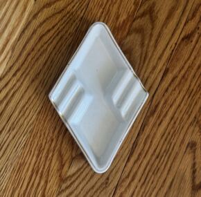 Unusual diamond-shaped ashtray for Italia Lines dated 3-1937.  In the circle & dart pattern.  Made by Richard Ginori with a pre-war Savoy crown.  Measures about 6.5″.  In great condition with no chips, cracks, or crazing.  Some loss of gold around top edge.  JF