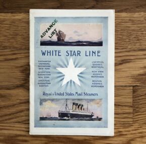 Here’s a special list!  There is so much to make this a stunning list for any White Star Line collector.  Let’s start with the cover, which is the same as used on RMS Titanic.  It is also marked “Advance List”–as is famously one for Titanic. Next up for this fabulous list is the date.  Baltic sailed from Liverpool to New York February 26, 1914–the very day of Britannic’s launch.