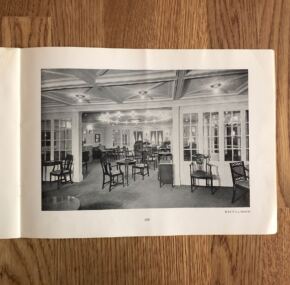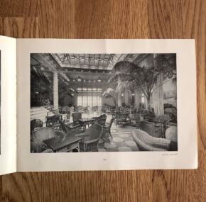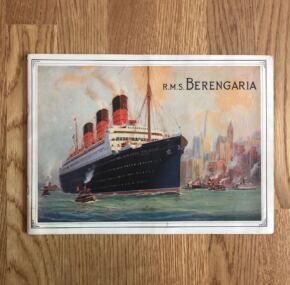 One of the best brochures ever done for Berengaria. With 24 pages with 18 full-page images of her first- and second-class public rooms, it is amazing to compare the interior of her and her sisters to ships that had come just 15 years before. As a side note, in my opinion, the Ballin trio had the finest swimming pools ever installed on any ship. They were literally Pompeiian in scale, and nothing before or since has even beaten them. The cover has a textured feel so that it has the appearance of a painting.