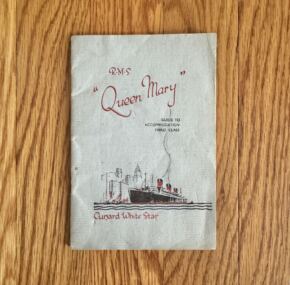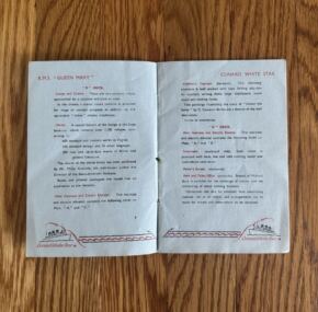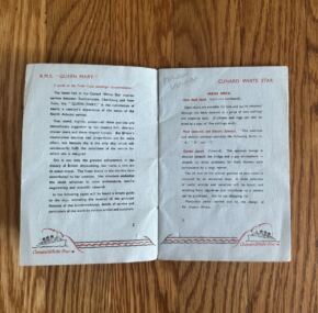 I have never seen a third-class information book from the time of the great ship’s maiden voyage.  We learn she is “not only the greatest achievement in the history of British shipbuilding, but that she “marks a new era in ocean travel.  The finest brains in the country have contributed to her creation….”  Full of information about the services and amenities provided to third-class passengers before the war.  Runs 18 pages.  In very good condition.