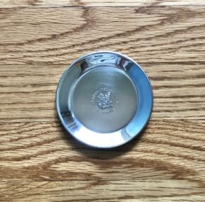 Silver pin dish hallmarked 885 (or 885 parts of silver per 1000).  Sterling silver is set by law at 925.  In its original box.  Dish measures about 3.75″ across and is in mint condition.