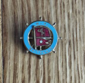 A Cunard White Star Line lapel pin sold in the on-board gift shops of this the famous last-sailing ship of the White Star Line fleet, which dates to the 1950s. I have often wondered why the Cunard Line never built another motor vessel, always opting for turbines. RMS Britannic gave great service and sipped fuel oil compared to her similarly sized fleet mates. She burned about 90 tons a day versus Queen Mary’s 1050 tons a day! Measures about a 1″ in diameter and in excellent condition. Haven’t had one for you in a while. AC