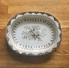 Another one of those rare items that Luxury Liner Row is known for! A superb serving platter for the British & North American Royal Mail Steam Packets (later known as Cunard Line). Agreed among steamship historians to be the first pattern used aboard the first Cunard ships (Britannia, Caledonia, Acadia, and Columbia) in 1840, this outstanding platter was made by Alcock & Co. This extremely rare pattern does not come up for sale very often in this condition, which is perfect–no chips, cracks, or crazing. Amazing for being nearly 200 years old! Measures about 15″ x 11.75″ x 2.25″.