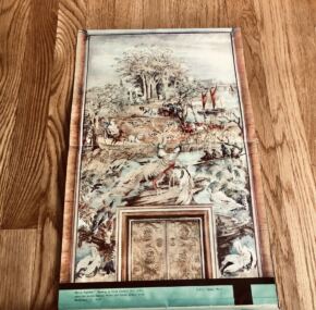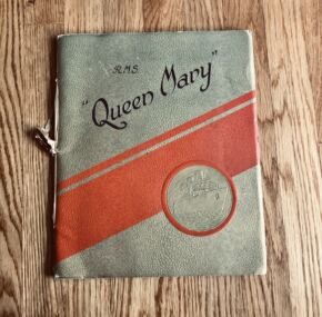 Given to passengers on the maiden voyage, this brochure has a faux-leather cover with great tipped-in color photos of the amazing art on the ship. Tied with a silk cord and sporting foldouts and the obligatory full-color center spread of the vessel. Leather-ized cover with embossed image of the ship. This lavish brochure would have been extremely expensive to produce and will become a highlight of any Queen Mary collection. It runs 40 pages.
