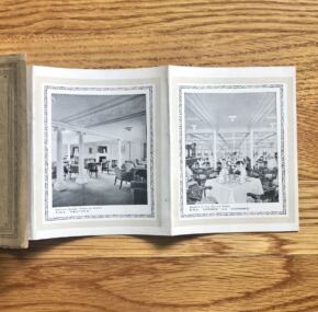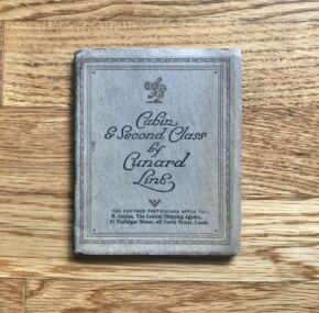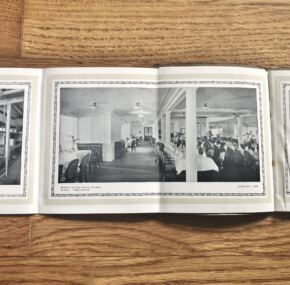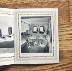 I couldn’t say it better myself.  But you know me.  I can’t help but add… Who can’t help himself but think of the Cunard folks offering us this small pamphlet for perusal in around 1923.  100 years ago.  Picture a younger American man who was thinking of a trip… taking the train home from work… considering this very brochure.   Now you can dream too.  Very good condition with lots of great images and details.  Foldouts, cool images, etc.  It’s the Saxonia and her photos that I like.