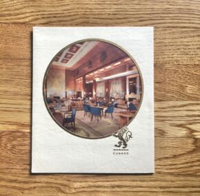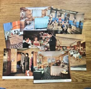 9 glossy full-color photos of life on board the great Cunard liners in the heyday era of the 1950s. Has its original embossed paper blurb offering crossings. Comes in a cardboard holder with a nice image of Queen Mary’s first-class lounge on the cover. The other images are unique and interesting spots on board that are not often seen or photographed. Step back in time!