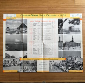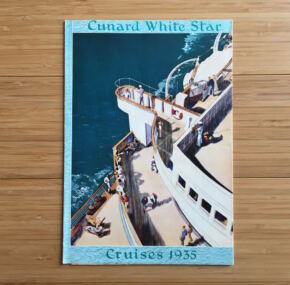 Colorful foldout brochure for Cunard White Star’s cruises in 1935. What ship would you have chosen? Homeric, Doric, Aquitania, or Lancastria? “A more thrilling program than ever!” Fantastic condition and really grand cover art.