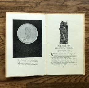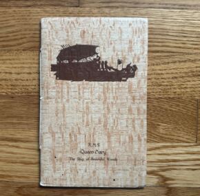 One of the best brochures you can get for the RMS Queen Mary. If you wanted to know anything about the woods used on board, this is the booklet you need. 32 pages with far too many images to list, some in full color. The author takes you on a tour through the vessel and critiques the public rooms and a number of the cabins on board. One in particular stands out because of his dislike of the wood used. It was a lot fun for me to walk around what is left of the Queen Mary with this book as a guide. Very wittily written. Excellent condition. Tied with a fancy cord.