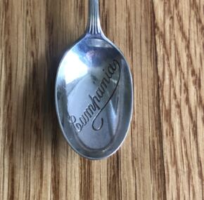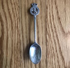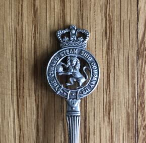 Souvenir sterling silver spoon of the finest type ever made for the Cunard Line. Sporting a date code of 1891. Measures about 5″ long. These were sold in the on-board gift shops of the liners. Sterling silver and made by Elkington. The spoon is surmounted by an absolutely stunning 3-D Cunard logo with the famous liner’s name engraved into the bowl. One of the best souvenir items you can get for any company. Beautiful classic design. These were only made, it seems, for the mainline pre-World War one ships. Measures 5″ in length. Near-mint condition.