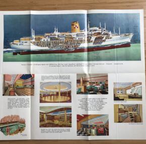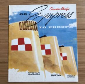A Canadian Pacific brochure for the “Newest White Empress and the Largest White Empress!” Great cover graphics! Sports a full-color cutaway, 16 color renderings, and 10 full-color photos. Covers both first and second class. She was lovely! Measures about 32″ x 18″ when opened. Excellent condition with a touch of foxing on the cover. Dates to 1961.