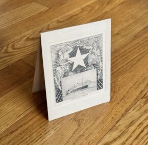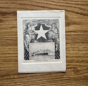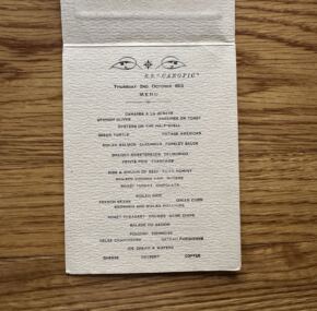 Pre-World War I menu from the RMS Canopic dated October 2, 1913, identical to the ones used on the RMS Olympic and RMS Titanic. Although not stated, given the items available, this has to be from first class. Canapes, green turtle soup, oysters on the half shell, boiled salmon with cucumber sauce, etc. What’s rare and intriguing about this menu is that it is also a music program for the same evening.