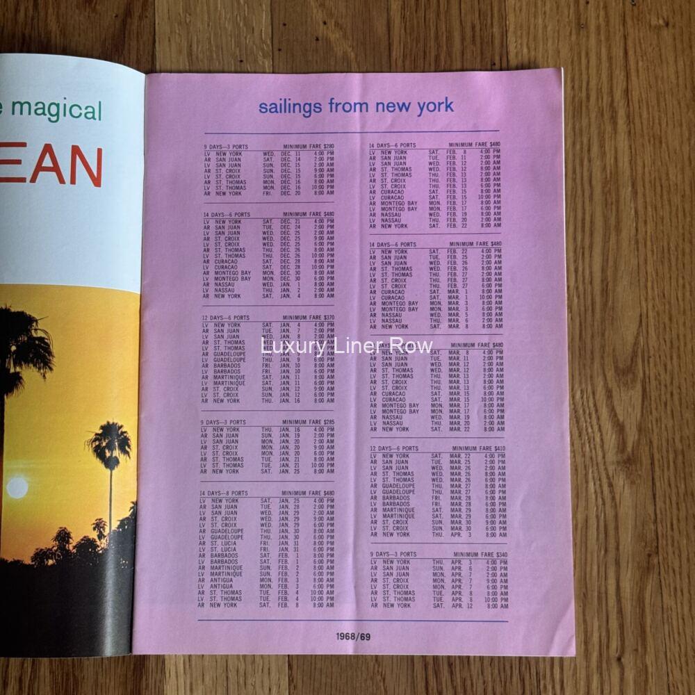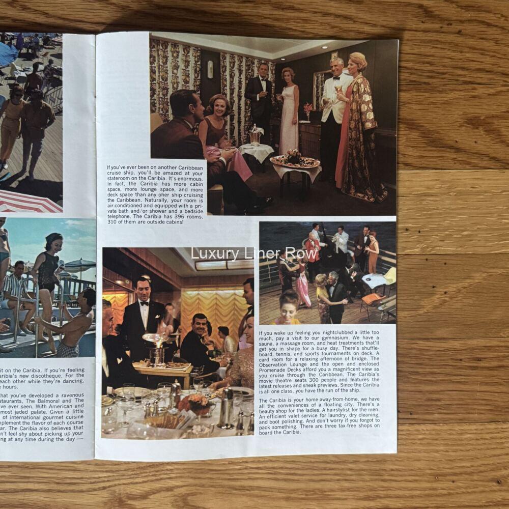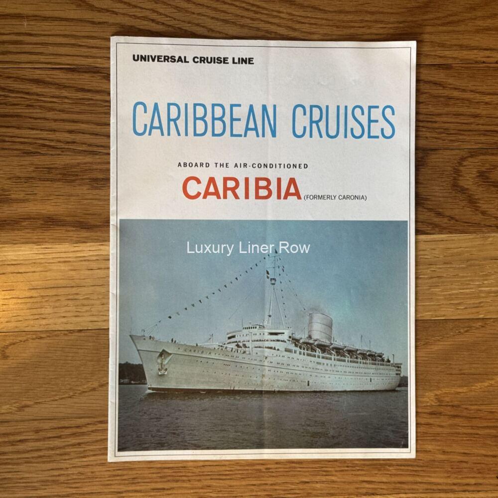 The only full-scale brochure ever produced for the Caribia, which was built as Cunard’s famous RMS Caronia. Caribia completed only one cruise in 1969. On her second attempt to cruise the Caribbean, her power switchboard exploded, and the ship drifted for a day until the Coast Guard came and fished her back to port. She would never sail with passengers again.