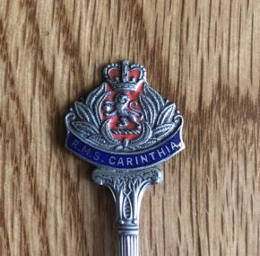 A fine sterling-silver and enamel spoon from the Cunarder Carinthia. One of the Canadian Quartet from the 1950s, these four ships that serviced Canada were not Cunard’s most popular. Excellent condition measuring about 4.25″ long.