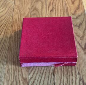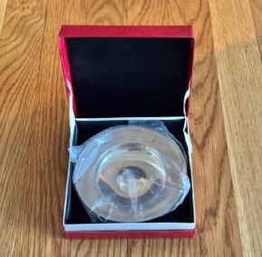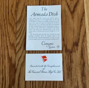Sterling silver souvenir gift from Cunard’s Green Goddess, the RMS Caronia. In its original box and containing its original paperwork. Still even in the original unopened shrink wrap from the 1960s. It has never been opened or polished. The silver dish measures about 4.5″ across. Peep the paperwork. A very high-quality souvenir. The paper hinge on the box has come apart and there is a bit of paper missing.